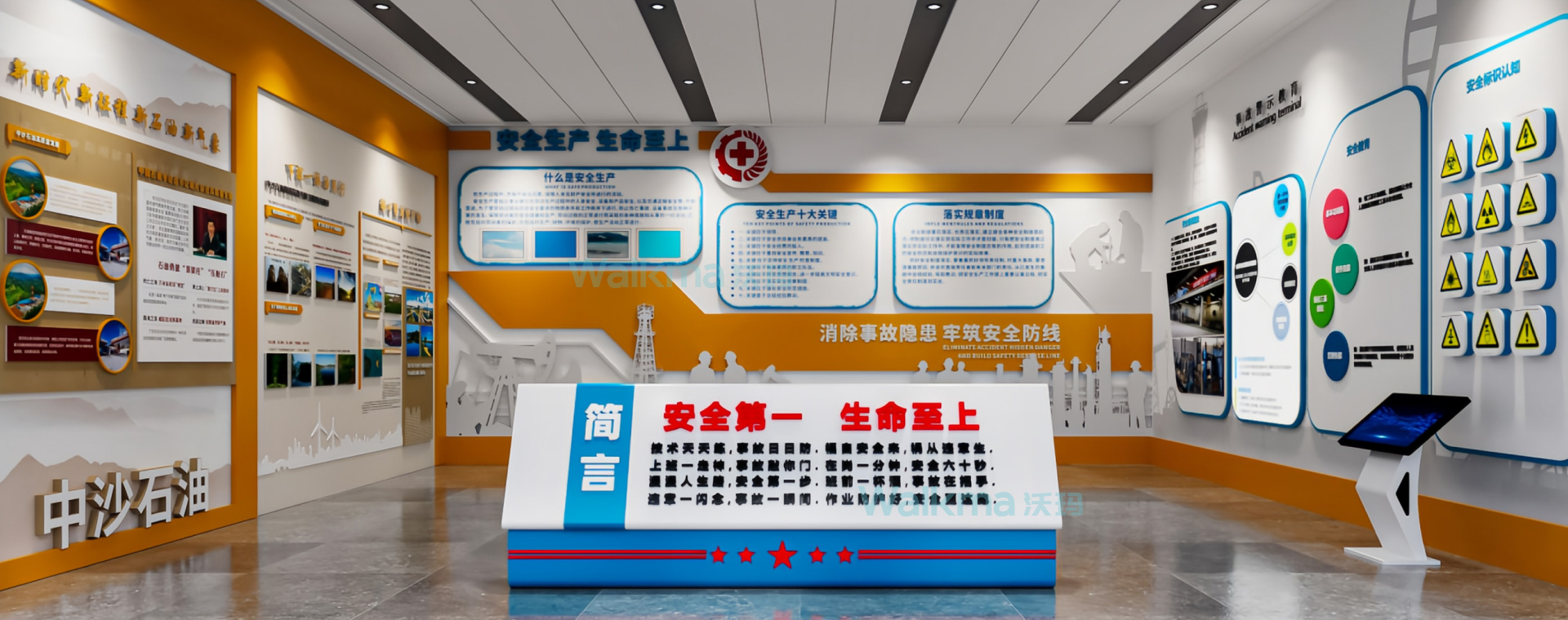 沃玛科普体验馆专业人员飞抵客户现场进行文化墙布置,主题装修,指导装机,安装,调试,技术培训,指导客户单位员工通晓实际使用效果体验